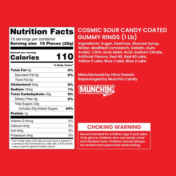 Dive into the delightful world of Cosmic Sour Candy Coated Gummy Rings! This bag offers a sweet and tangy fruit gummy experience. Perfect for Halloween and Christmas candy treats, these gummies are a fun, fruity delight. Each bite combines the best of both worlds: sour and sweet. Ideal for sharing or enjoying alone, these gummies are a must-have for any candy lover.